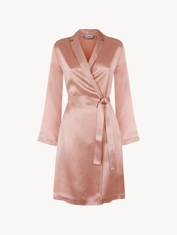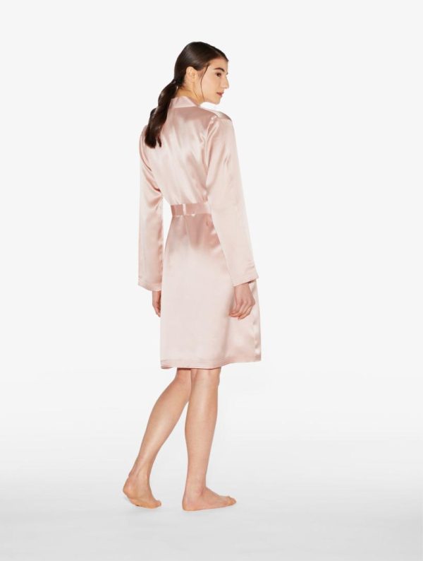 A short silk satin robe that creates a luxurious mood with its lustrous finish and sumptuous feel. Comfortable and classic, yet feminine with its pale powder pink hue, it provides the perfect cover-up before bed or on leisurely afternoons at home. Features a soft collar, a waist belt, side pockets and subtle top stitching detail to finish the hem and cuffs. Wear over the matching short silk slip.