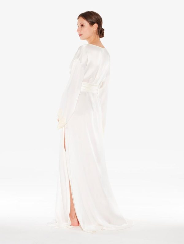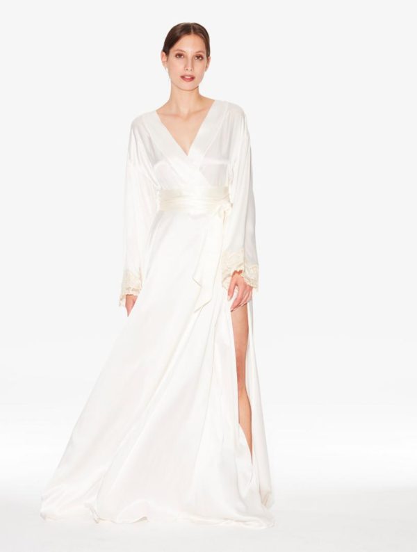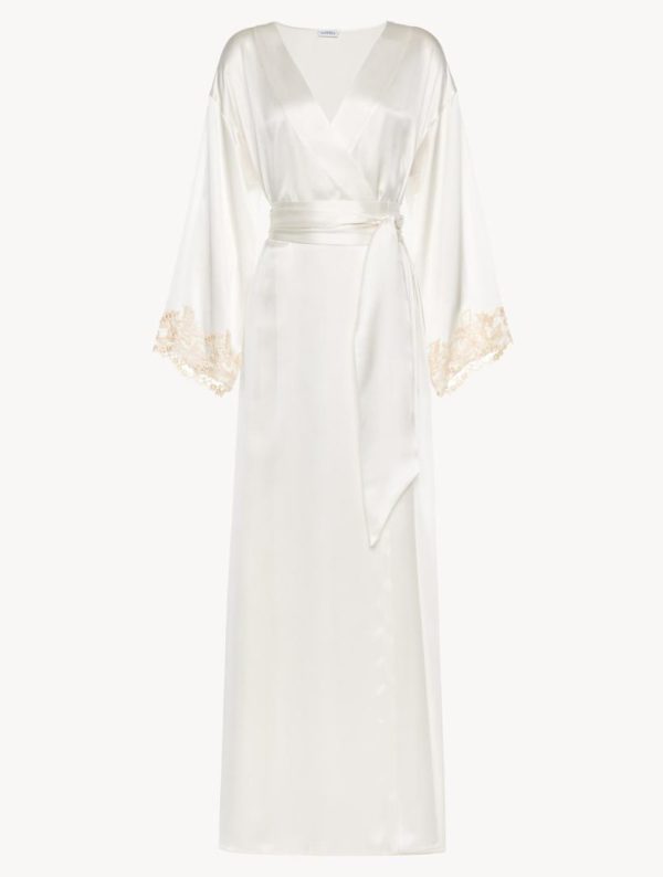 The most luxurious piece in the La Perla Maison collection features embroidered motifs on a tulle background in the same colour as the silk, hand finished with a double-frastaglio technique. Silk satin long robe embellished with embroidery on tulle backing in the same colour silk. Finished with hand-embroidered double frastaglio embroidery. A modern yet elegant creation that represents the newest and most exquisite style in the La Perla Maison collection. Length 155 cm. Made in Italy.