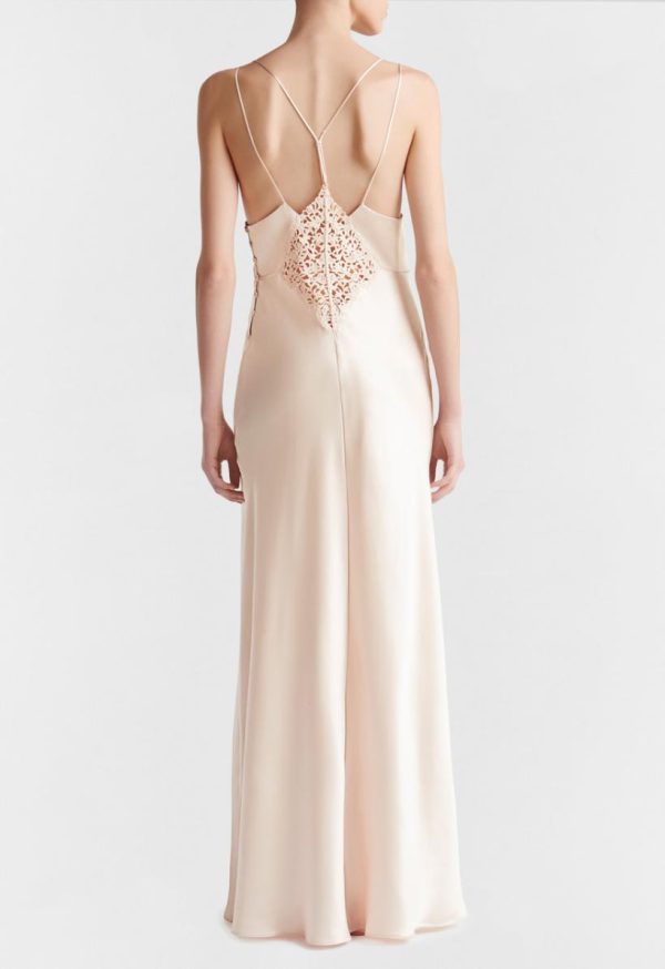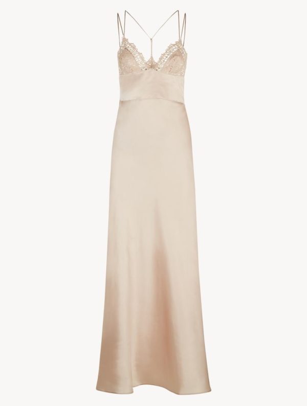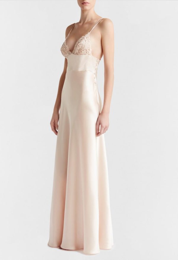 Long night dress in pure silk satin embellished with refined macramé frastaglio appliqué. Details in stretch silk organza. Made in Italy.